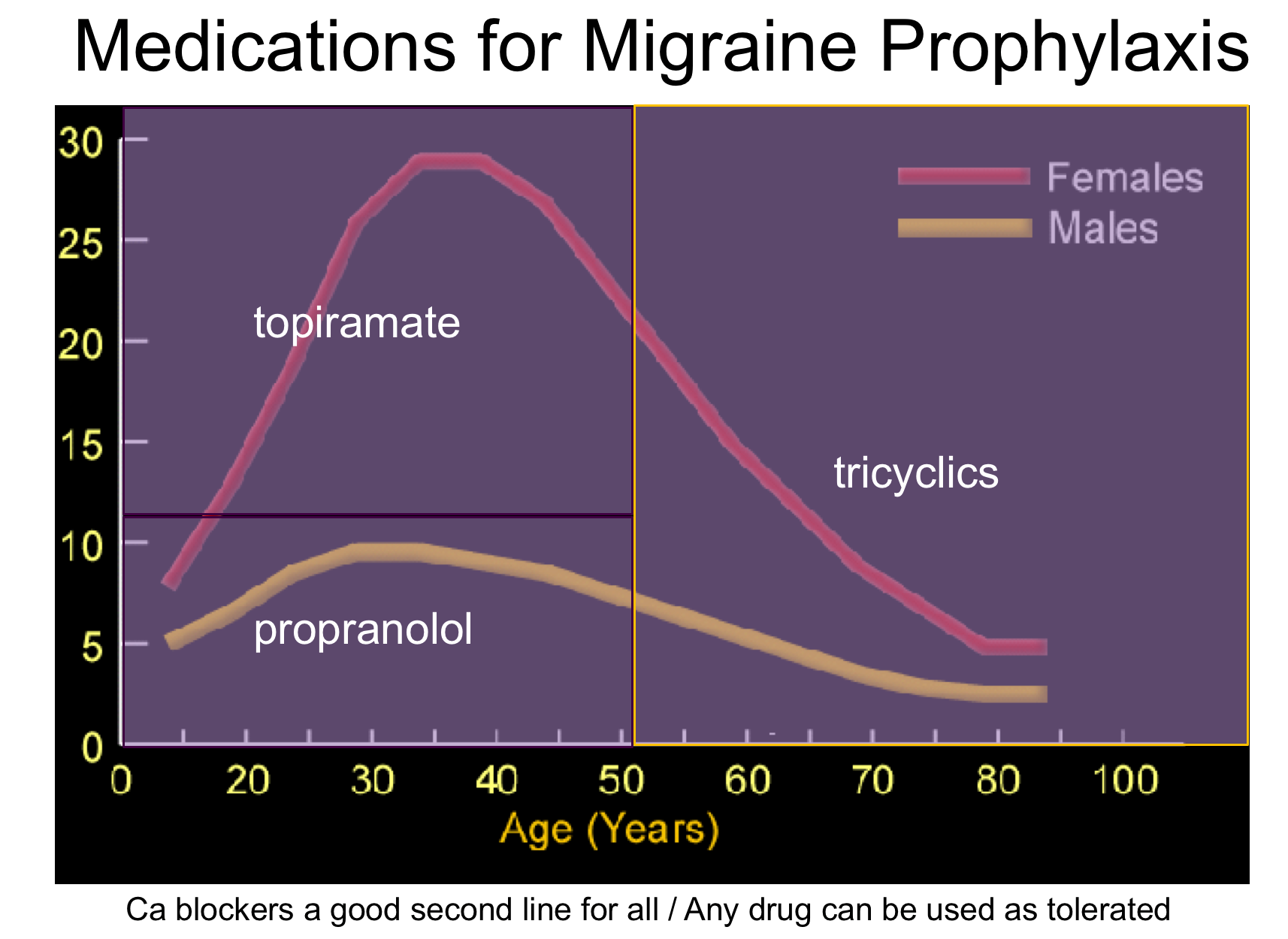 For patients over 50 the first “go to” medication is low dose nortriptyline (10 mg capsules, take 2HS Dispense 60 refillx5). Nortriptyline may work as well as it does in these patients because it has so many mechanisms of action: all tricyclic antidepressants are synthesized from an antihistamine base so has some antihistamine action with mild vestibular suppressant activity. It is also a medium potency calcium and sodium channel blocker, as well as an SNRI. In addition, it is anticholinergic; this is important because many chronic migraine sufferers have increased parasympathetic tone as a part of their migraine syndrome that leads to hypotension and orthostasis, as well as GI symptoms. Parasympathetic tone changes also cause tearing, nasal congestion and rhinorrhea.