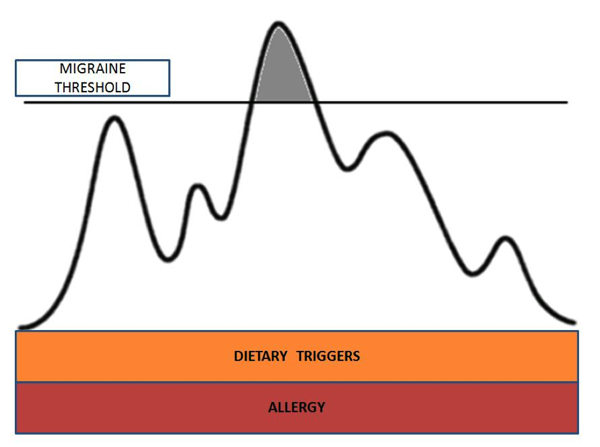 Tal como puede verse en la figura debajo, los disparadores ambientales, fisiológicos y alimenticios pueden sumarse de diferentes maneras en días diferentes. Cuando el umbral de migraña de una persona es superado, comienzan a generarse dolores de cabeza u otros síntomas relacionados a la migraña. La eliminación de cualquier disparador como disparadores alimenticios y alergia pueden dar más lugar a otros disparadores menos controlables, como el estrés y los cambios climáticos, para que se sumen antes de superar el umbral de migraña. Reducir la carga de disparadores resulta en síntomas severos cada vez menos frecuentes.